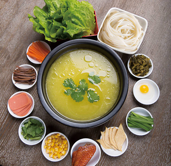 十秒到過橋米線的高湯是用大骨、老母雞、云南宣威火腿經長時間熬煮而成,采集骨湯精華。其中湯底分為味重色濃香辣的麻辣湯底和清淡醇香的清湯底。米線及其它輔料均采用上等食材,米線口感滑潤有勁道,配以嚴格甄選的上等新鮮蔬菜、肉片等輔料。味香而不油膩、鮮美卻不燥舌。