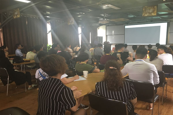 加盟商們觀看博多公司16年發(fā)展歷程的短片