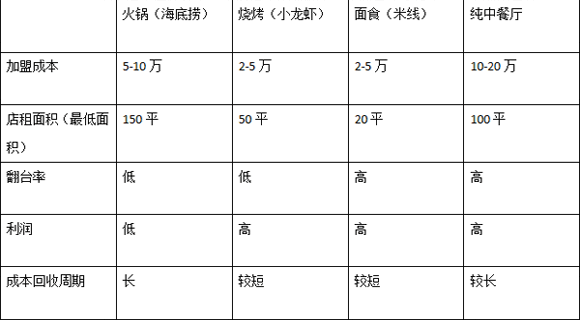 火鍋雖然較為火爆,但市場較飽和,并且初期投資過于高昂,成本回收周期也長。中餐與火鍋情況基本相同,但是很看重商鋪地段。燒烤較其他來說,優勢很明顯,也是目前市面上火爆的一大熱點項目,缺點在于,翻臺率低,不符合當下社會快節奏趨勢。面食(米線)在目前看來還是非常有發展前景的。